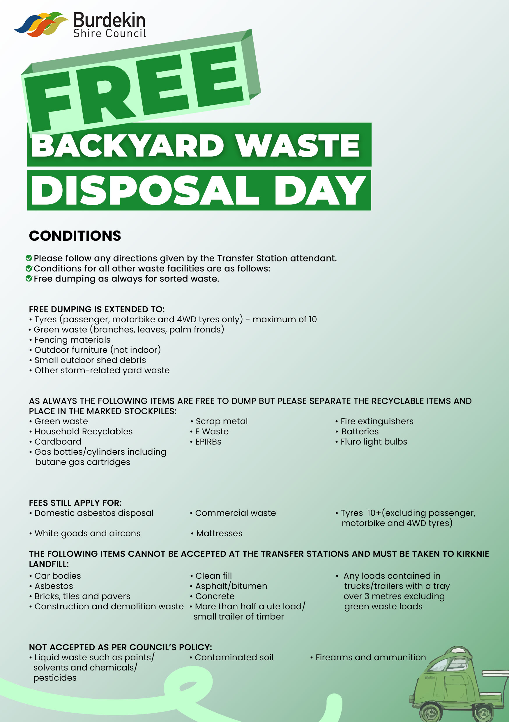 Burdekin residents will have the opportunity to clean up their backyards for free during a special waste disposal weekend on Saturday 24 and Sunday 25 May 2025.